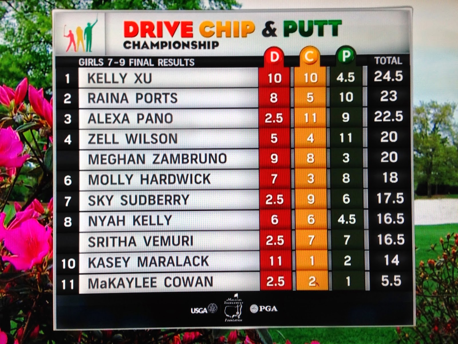 Penmar's very own Kelly Xu won the Girls 7-9 Division at the inaugural Drive, Chip & Putt Championship held at Augusta National Golf Club. She was among 8 kids to beat out over 17,000 other competitors from around the nation. Since her division was the first girls championship to finish, she was also crowned Augusta National's first ever female champion. Somewhere Martha Burk must be smiling.
